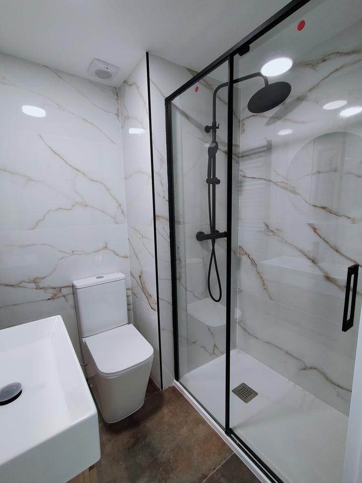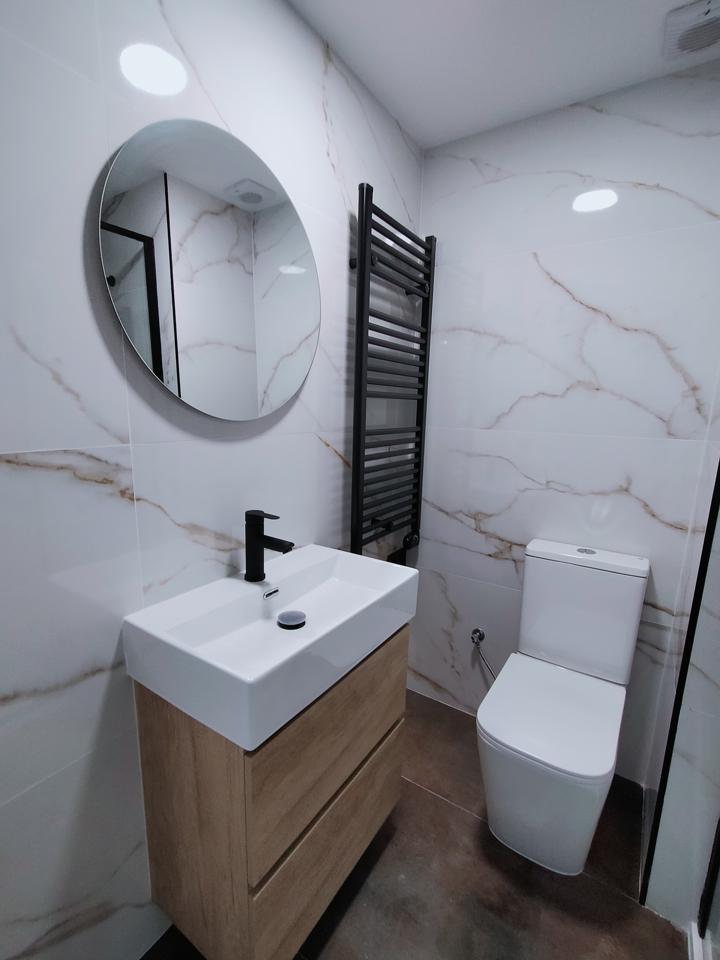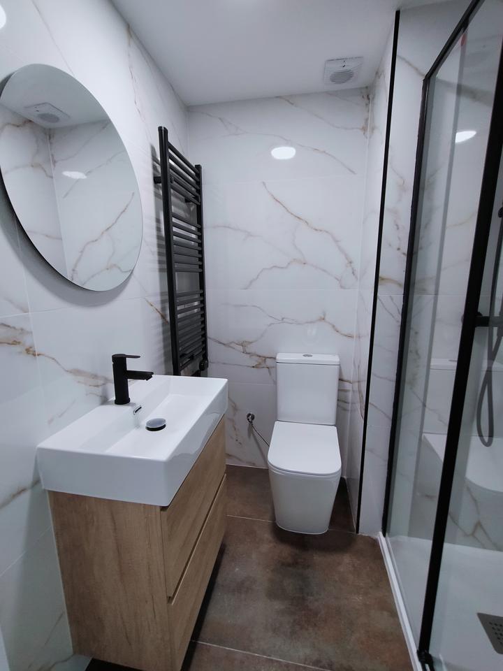 Baño con Mueble de Lavabo, Espejo Retroiluminado, Plato de Ducha con Mampara y Perfilería en Negro y Radiador-Toallero.