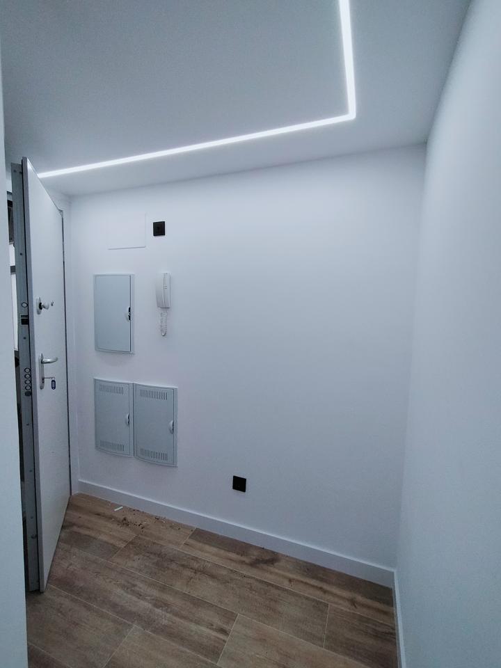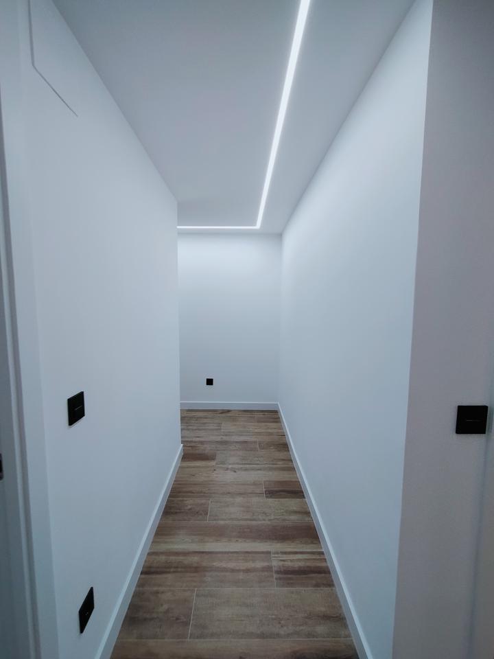 Suelos de Gres Porcelánico imitación madera y con rodapié en blanco en toda la Vivienda y Gres Porcelánico en Baño.