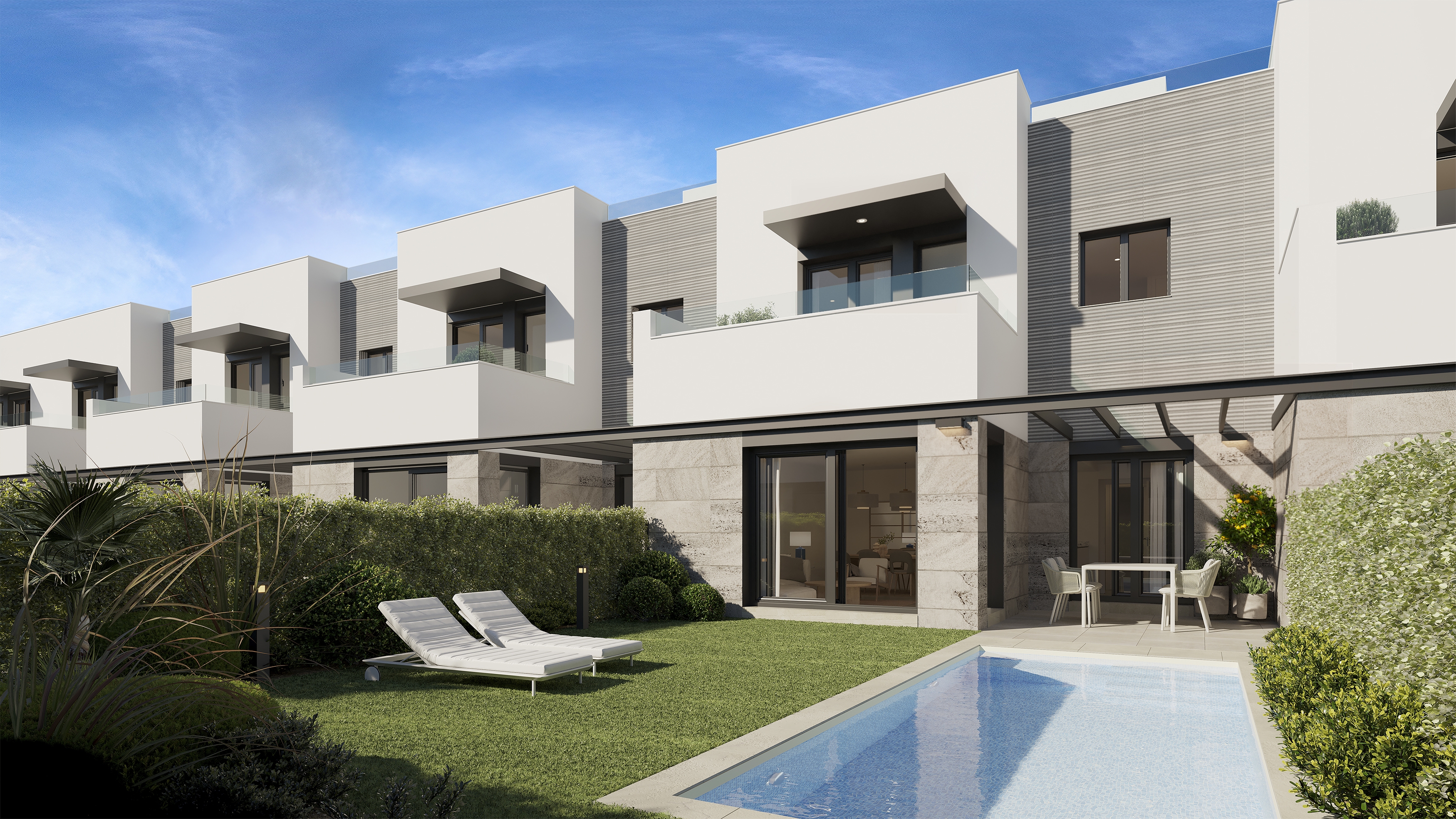 Experience the luxury of a newly built property with a private pool, roof terrace and garden, all within walking distance to the beach front.