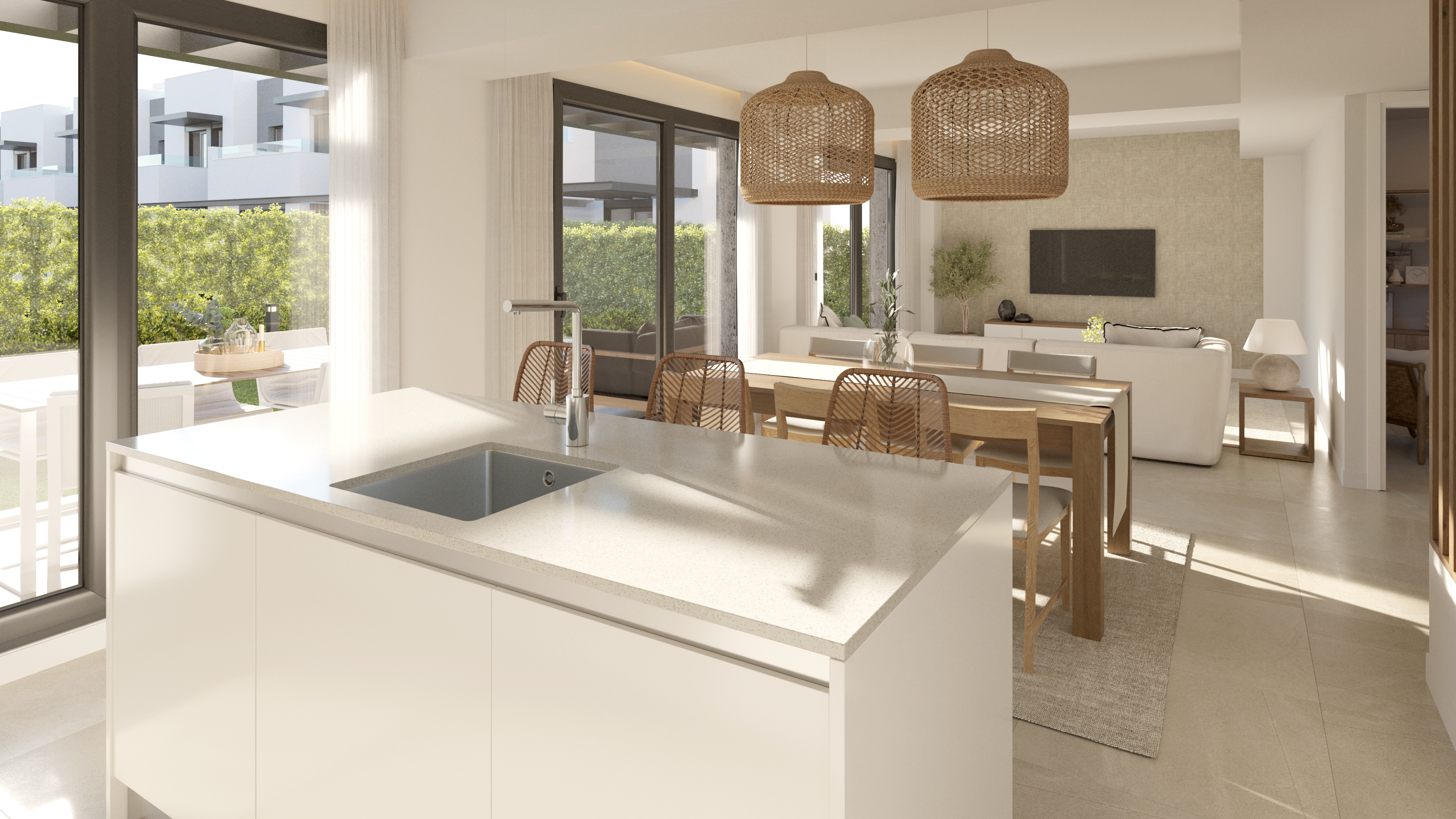 The beautiful garden is 130 square metres and includes an inviting swimming pool.This property combines modern and luxurious design with open spaces and modern functionalities.