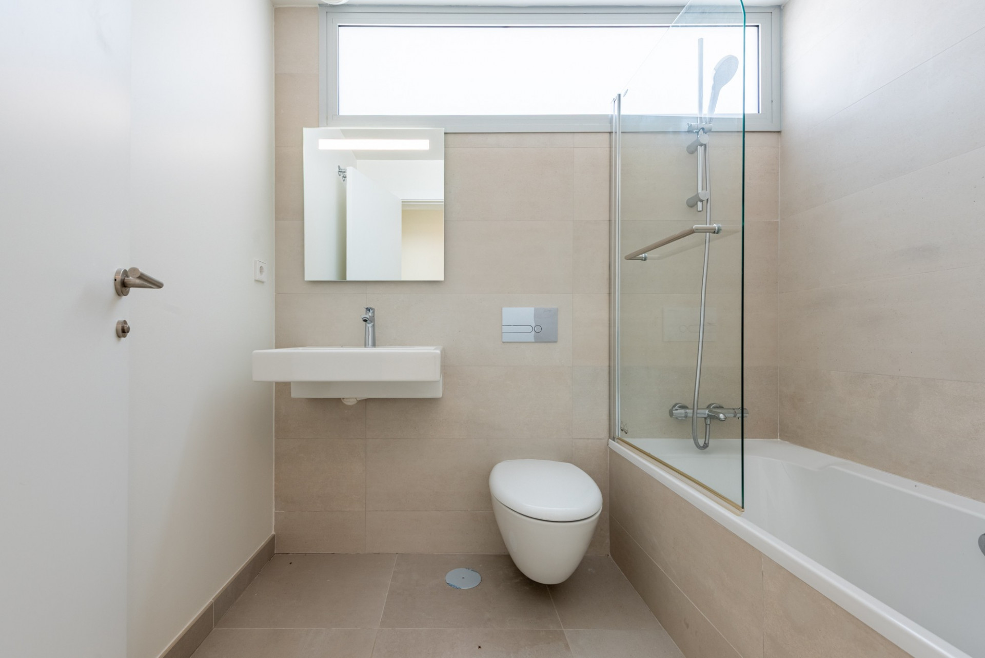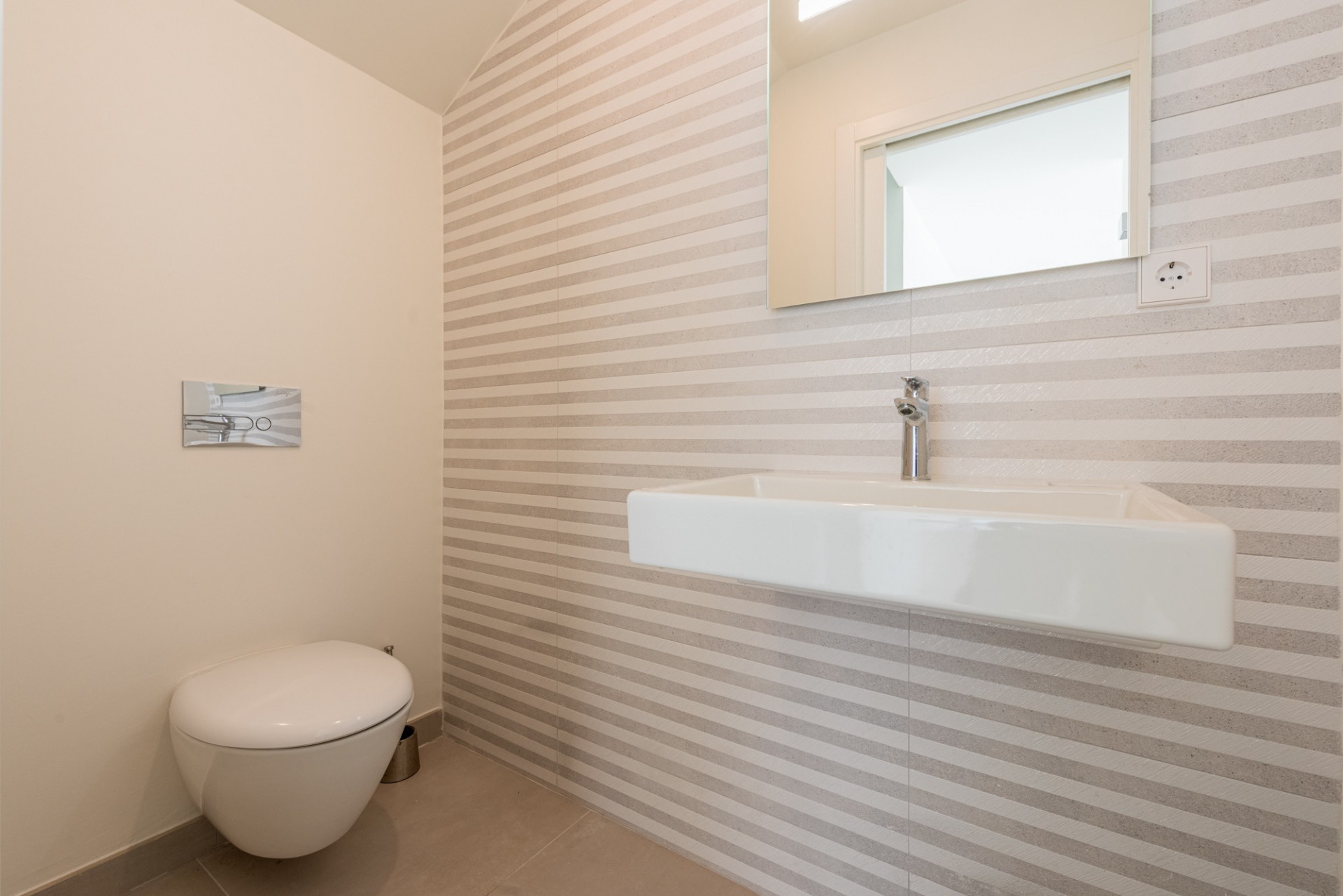 The ground floor welcomes you with a sleek open-plan living and dining area, flooded with natural light through floor-to-ceiling glass windows, opening onto two covered terraces, a private garden, and a swimming pool—ideal for seamless indoor-outdoor living.