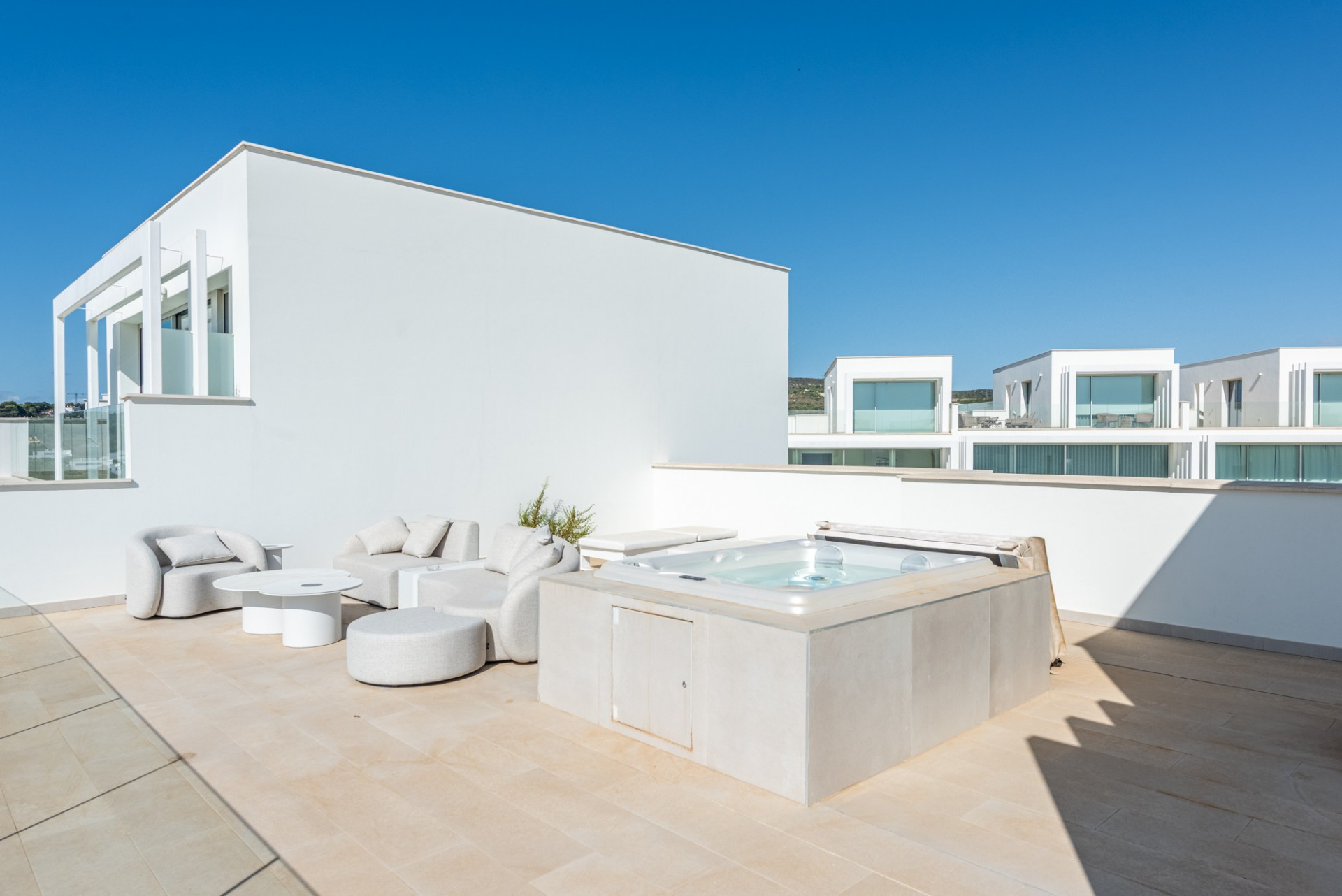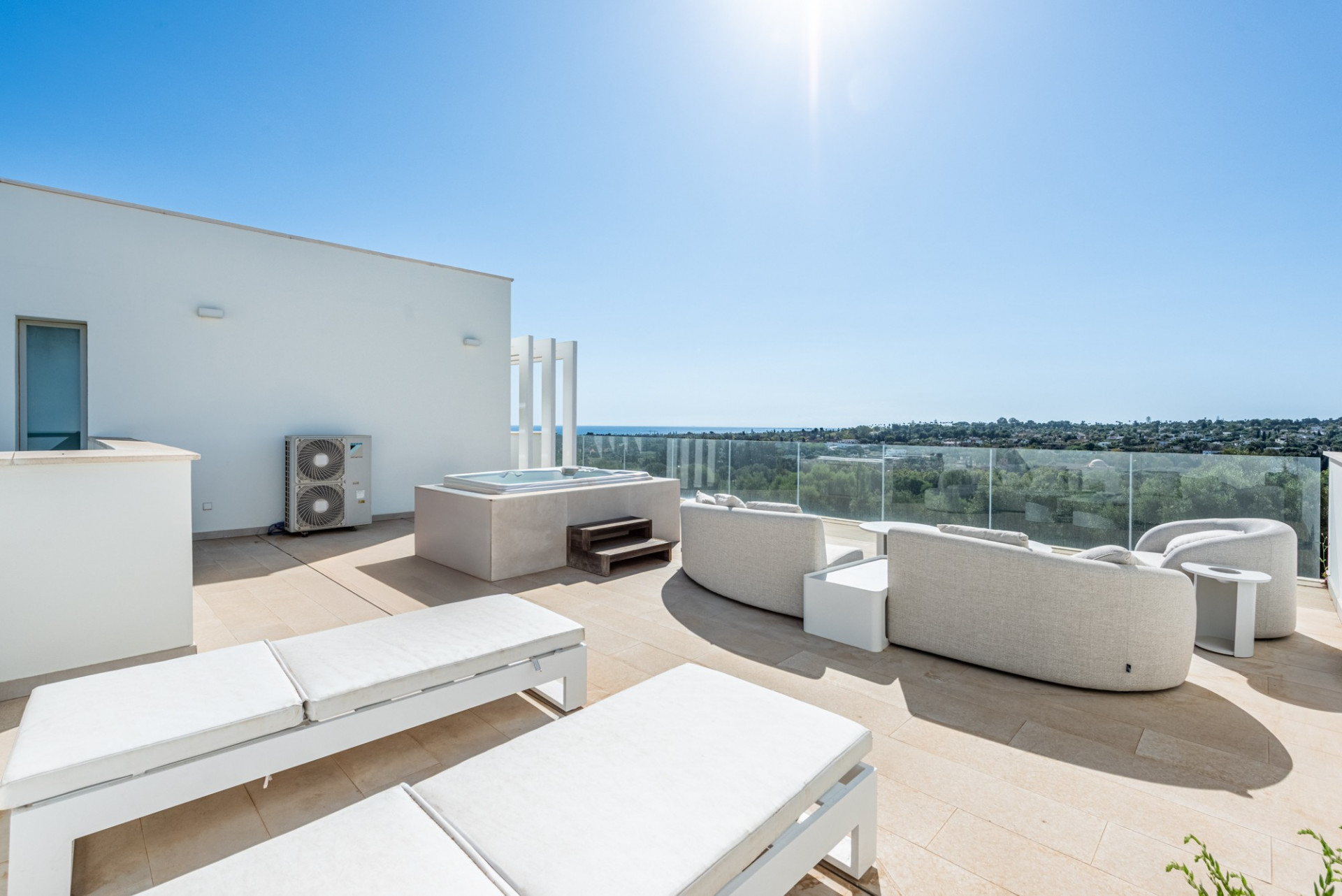 The top floor is a private oasis featuring a large solarium with: ✅ A built-in jacuzzi ✅ Outdoor kitchen/barbecue area ✅ bathroom ✅ Ample space for sun loungers and entertaining, all set against the backdrop of panoramic views across Sotogrande, the beach, and the surrounding countryside Comfort is assured year-round with underfloor heating and hot & cold air conditioning throughout.