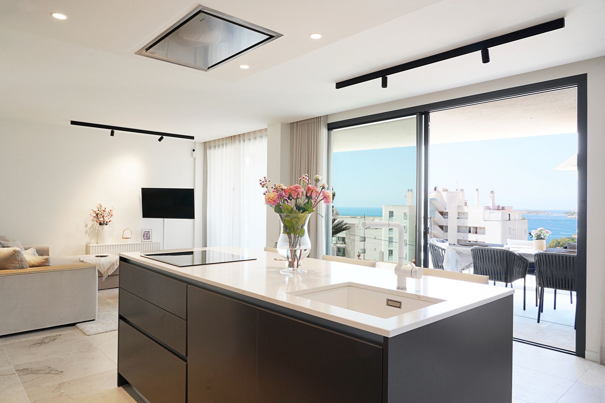 Desde el salón, la cocina y la encantadora terraza se puede disfrutar de unas bonitas vistas al mar.