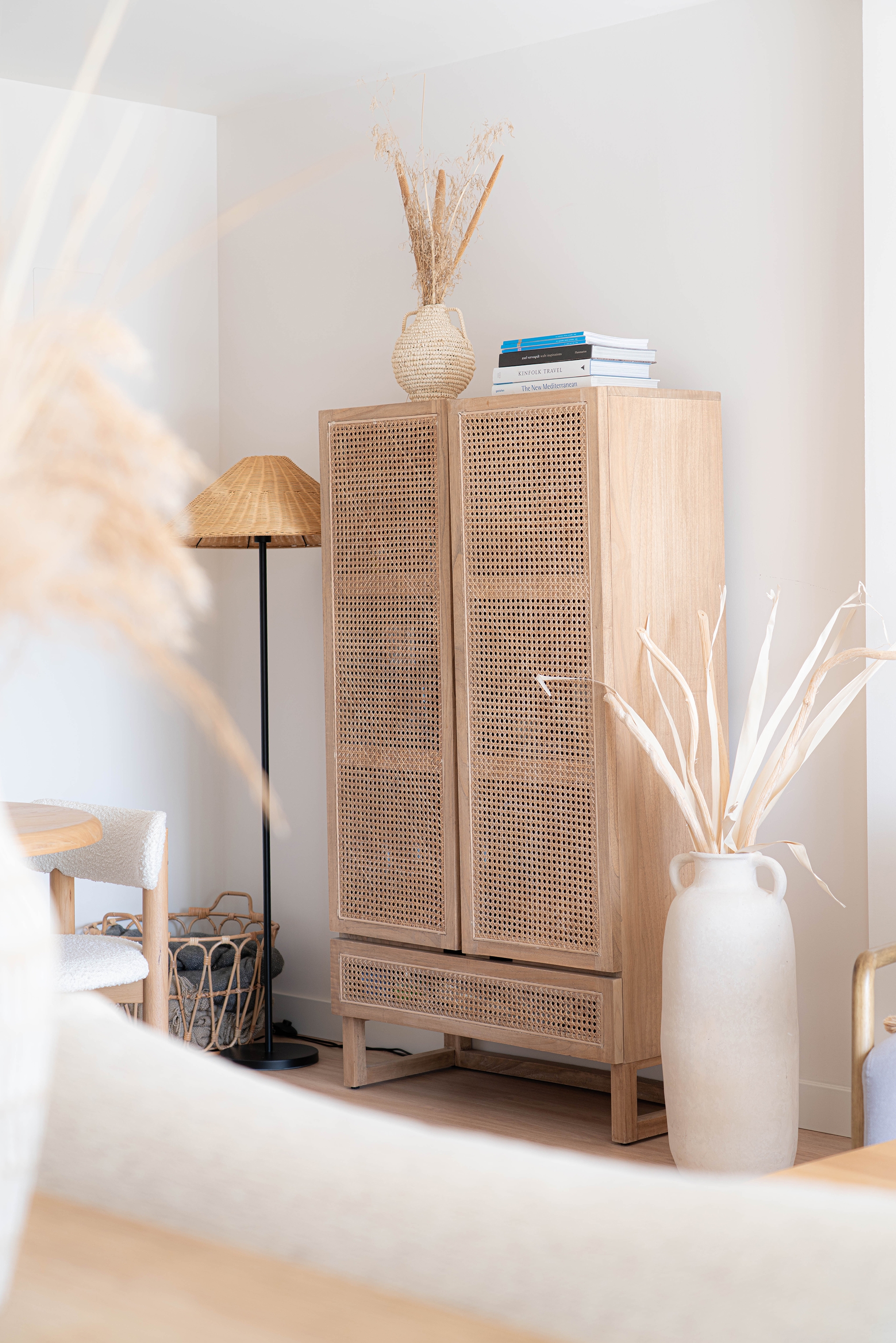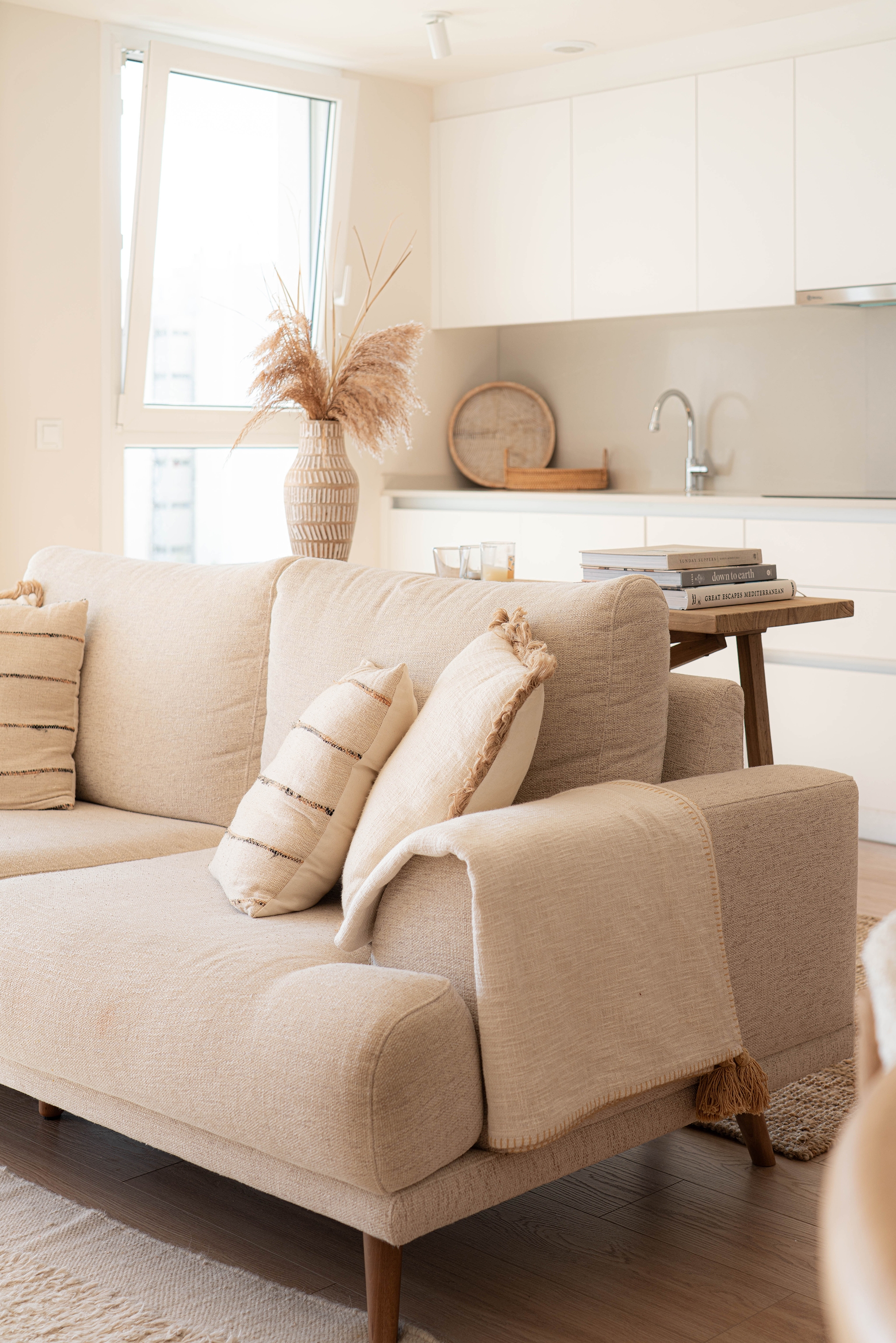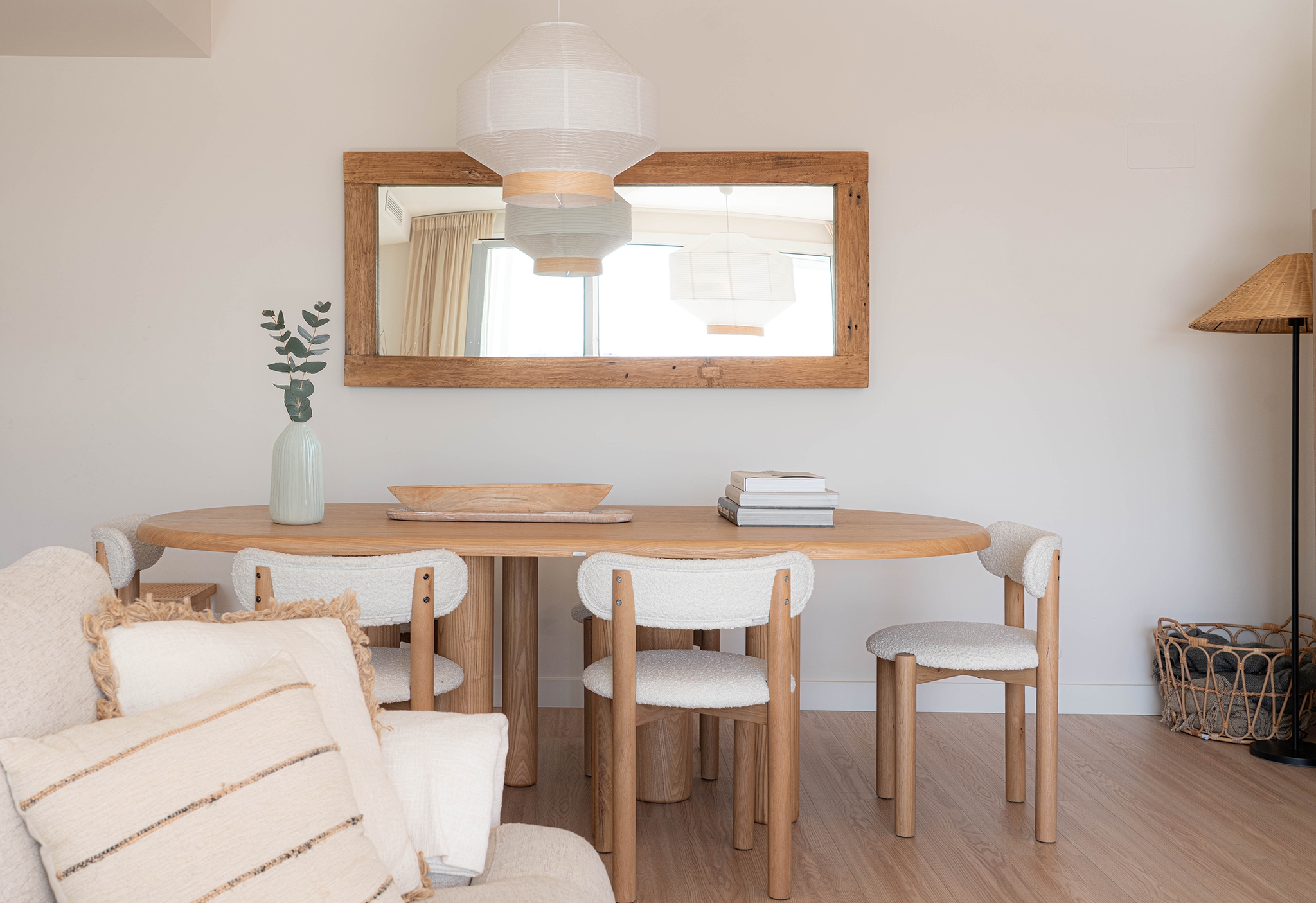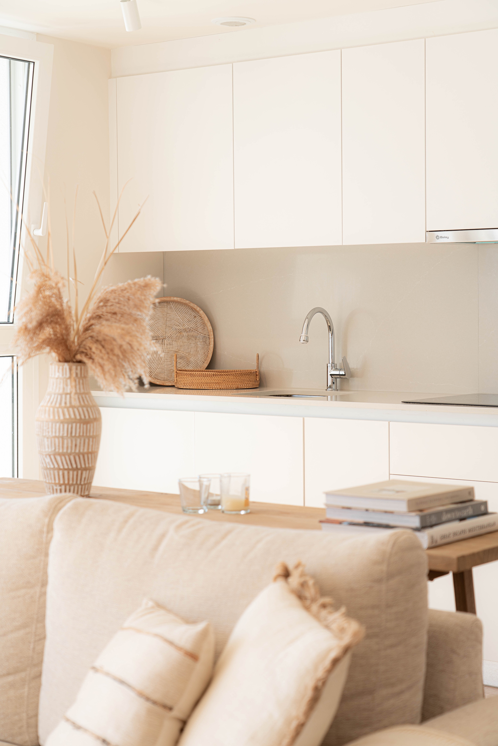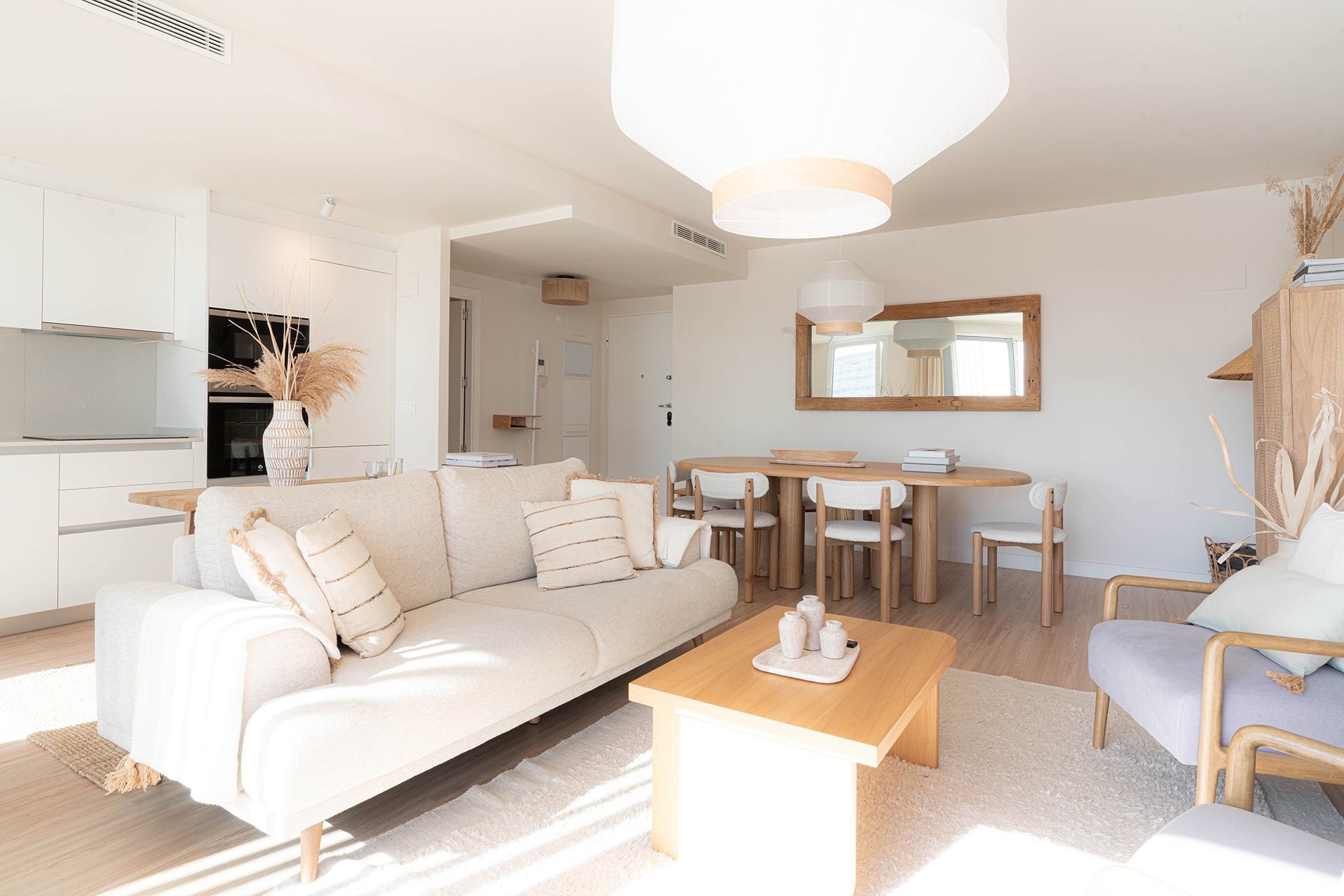 La vivienda ofrece 82 m² distribuidos en dos dormitorios y dos modernos baños. La cocina es totalmente equipada y abierta con el salón y el comedor.