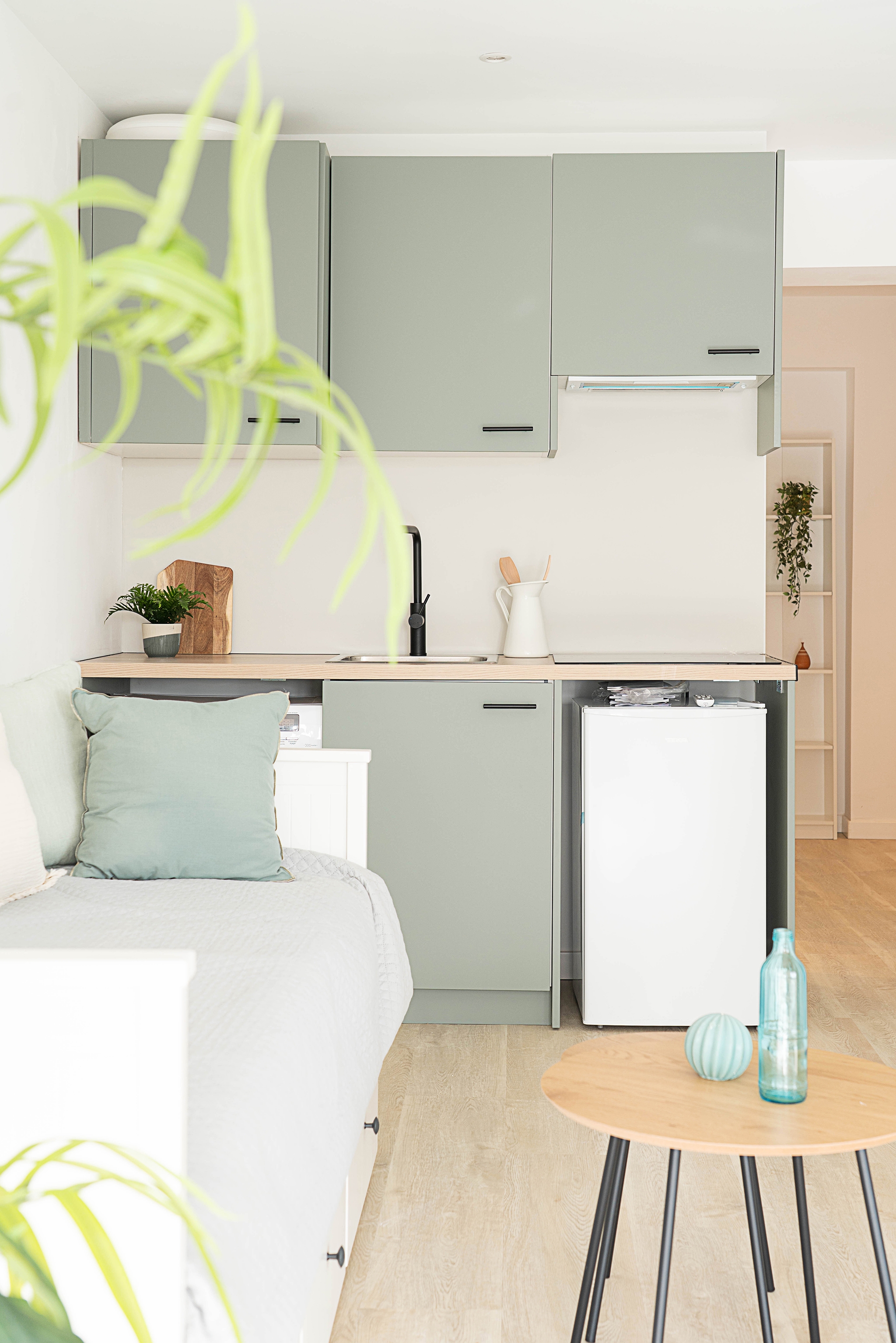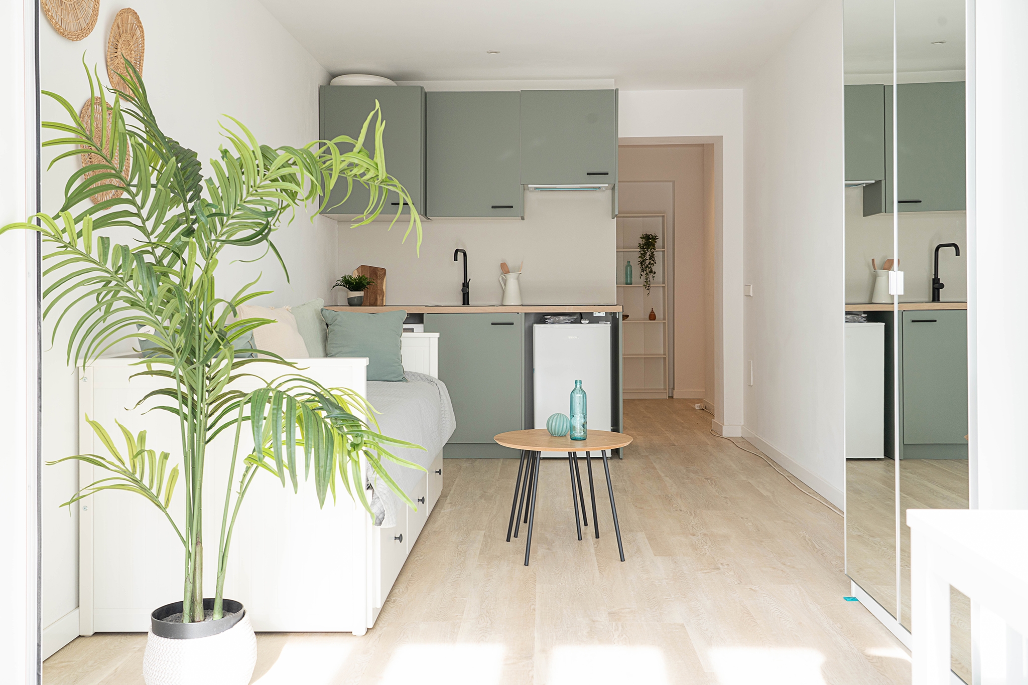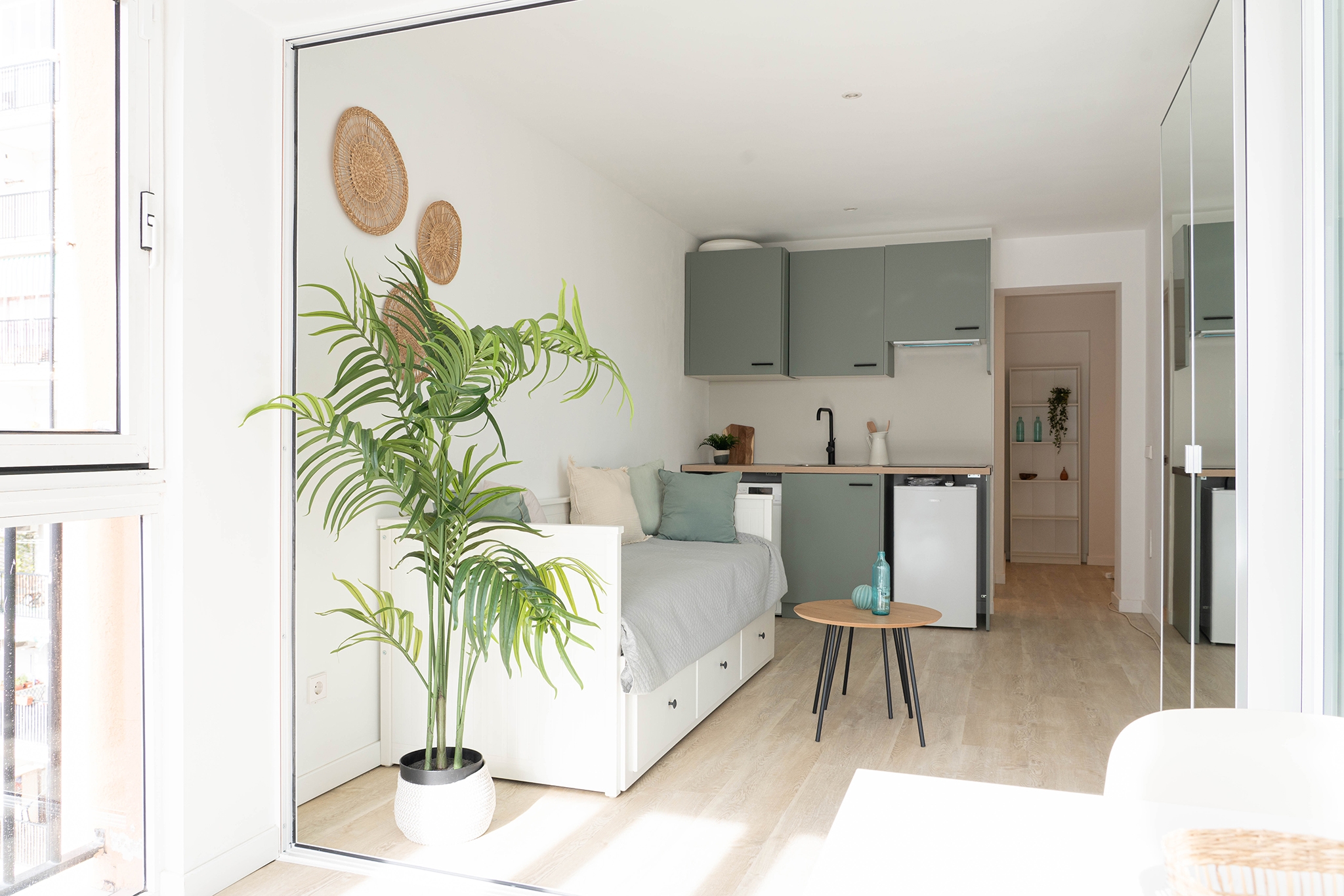 La distribución es abierta y muy bien pensada, con recibidor, cocina, zona de estar/dormitorio y comedor en un solo ambiente.